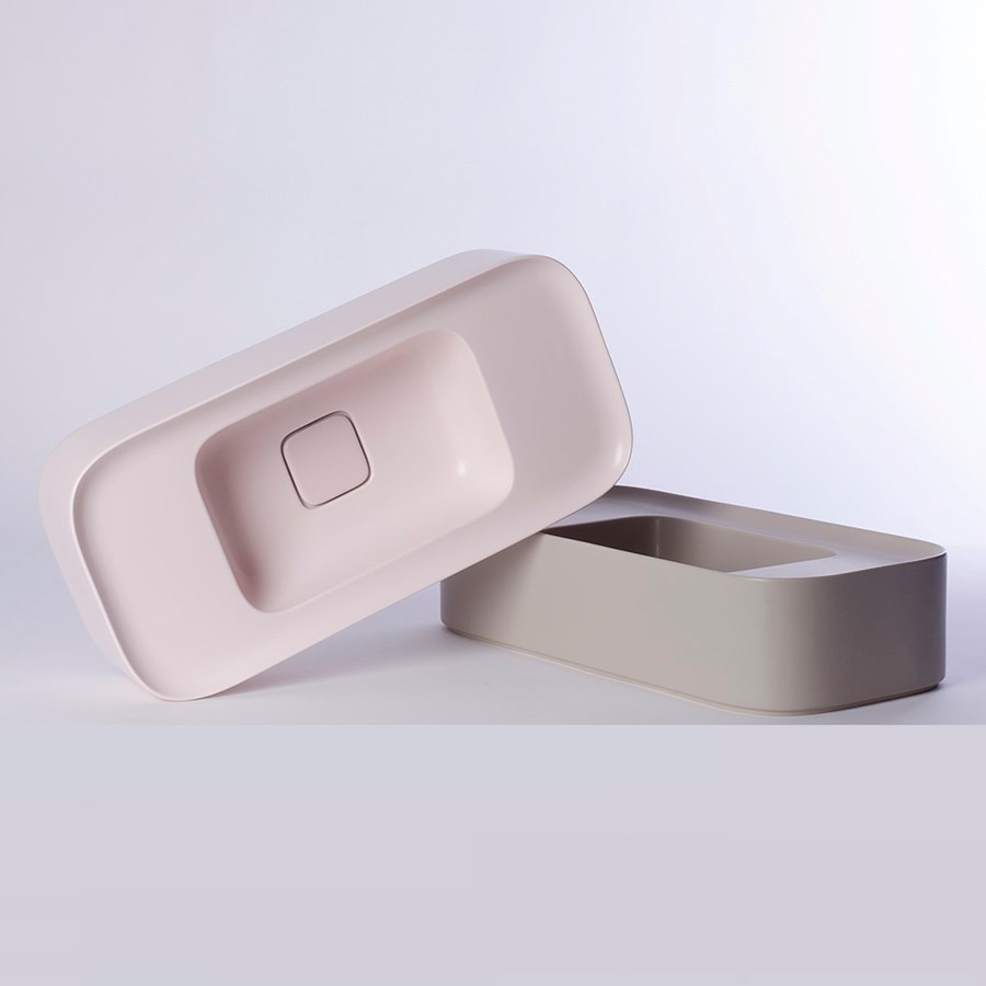 Matt Rosa farget servant - Firkantet design med runde formerPorselensvask i Matt rosa farge frittstående på benkeplateMatt rosa porselensvask frittstående på servantskapServant 52 x 40 i Rosa farge frittstående på baderomsmøbel