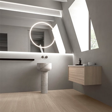 Gulvstående servant i Carrara-marmor og vegghengt skap i Lys Ash